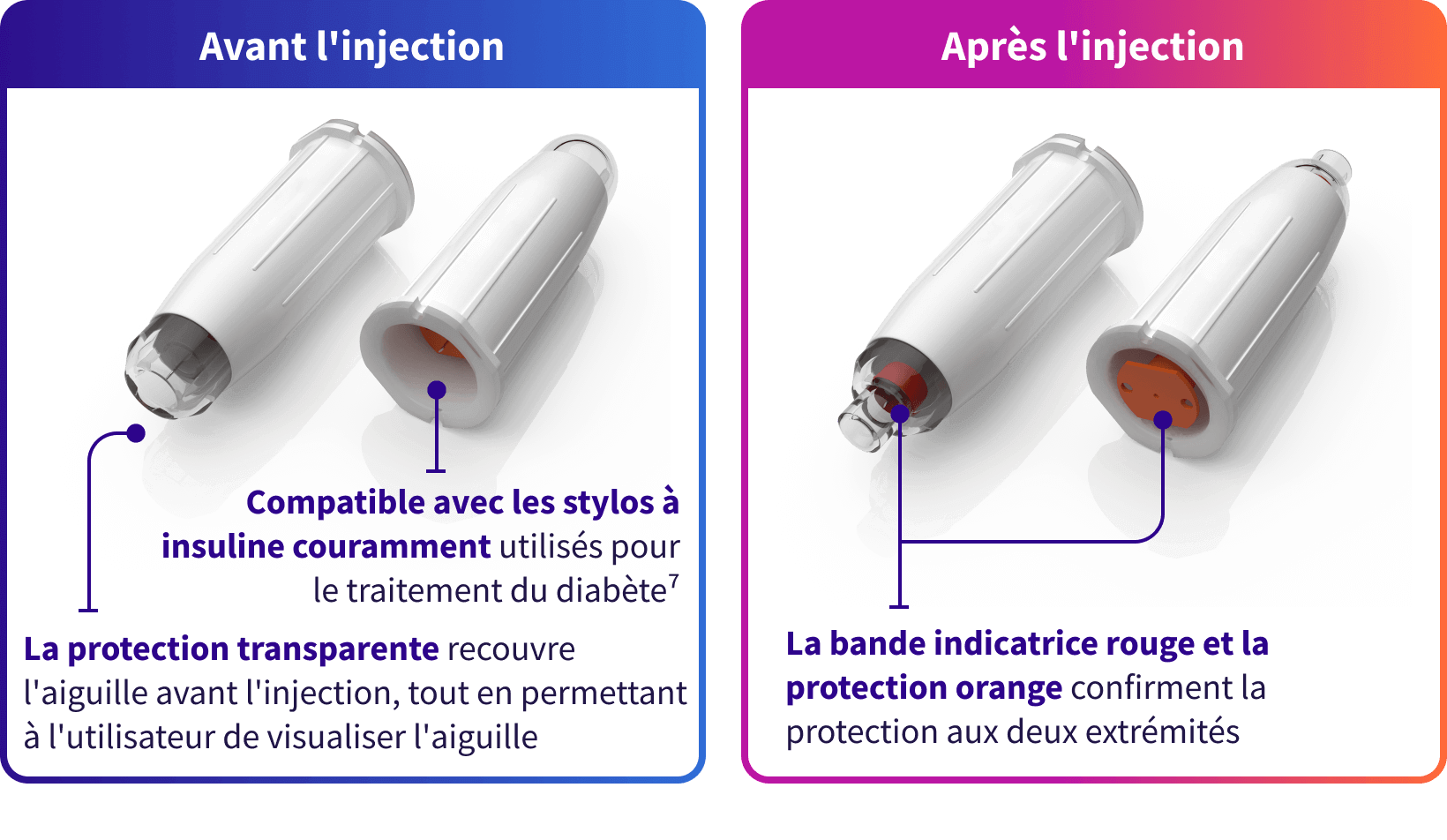Il est recommandé d'utiliser des aiguilles sécurisées de 5 mm sans pli cutané, ce qui minimise le risque de blessure par piqûre d'aiguille.1‡