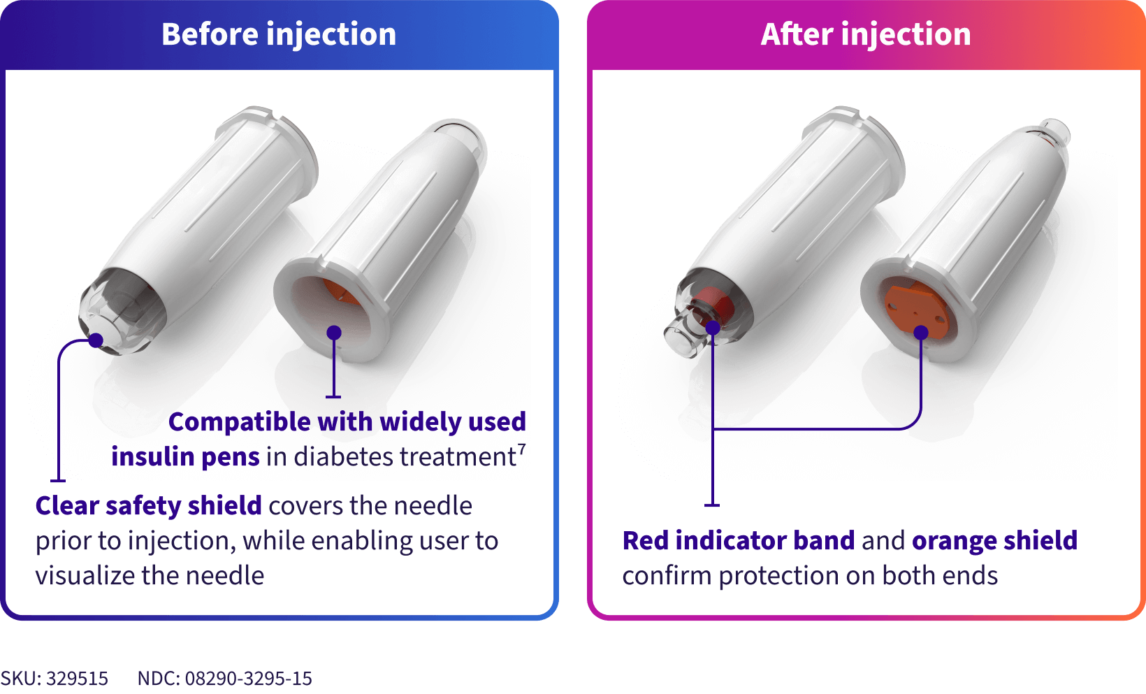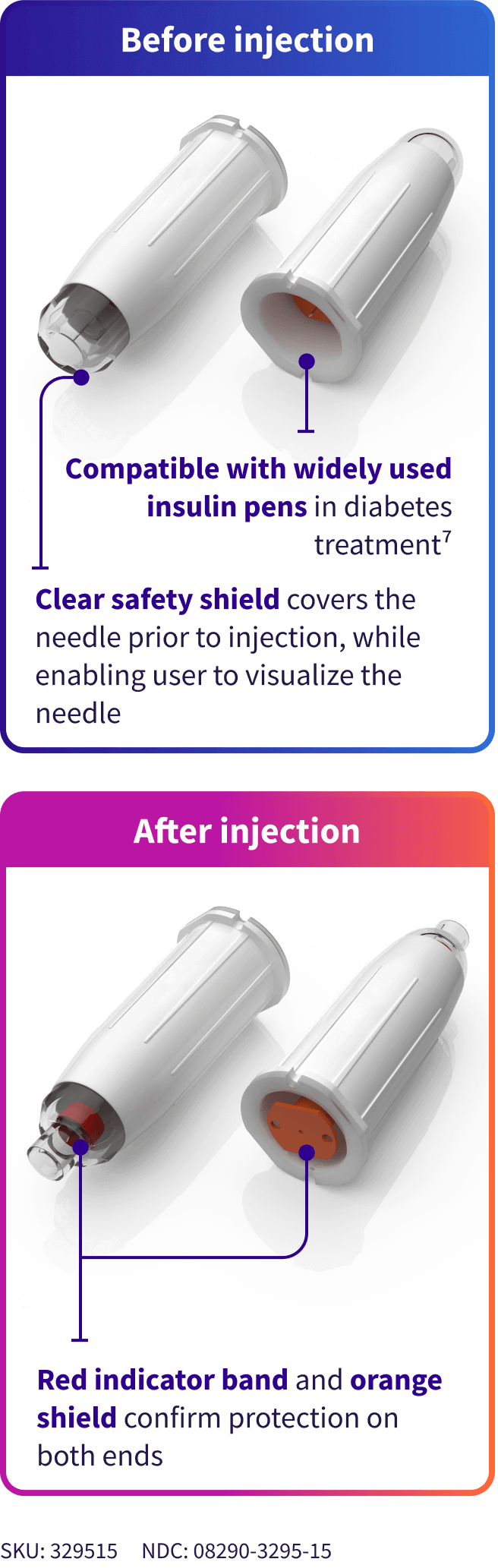 The AutoShield DuoTM 5mm Safety Pen Needle automatically conceals both ends of the needle after use, reducing the risk of accidental NSIs