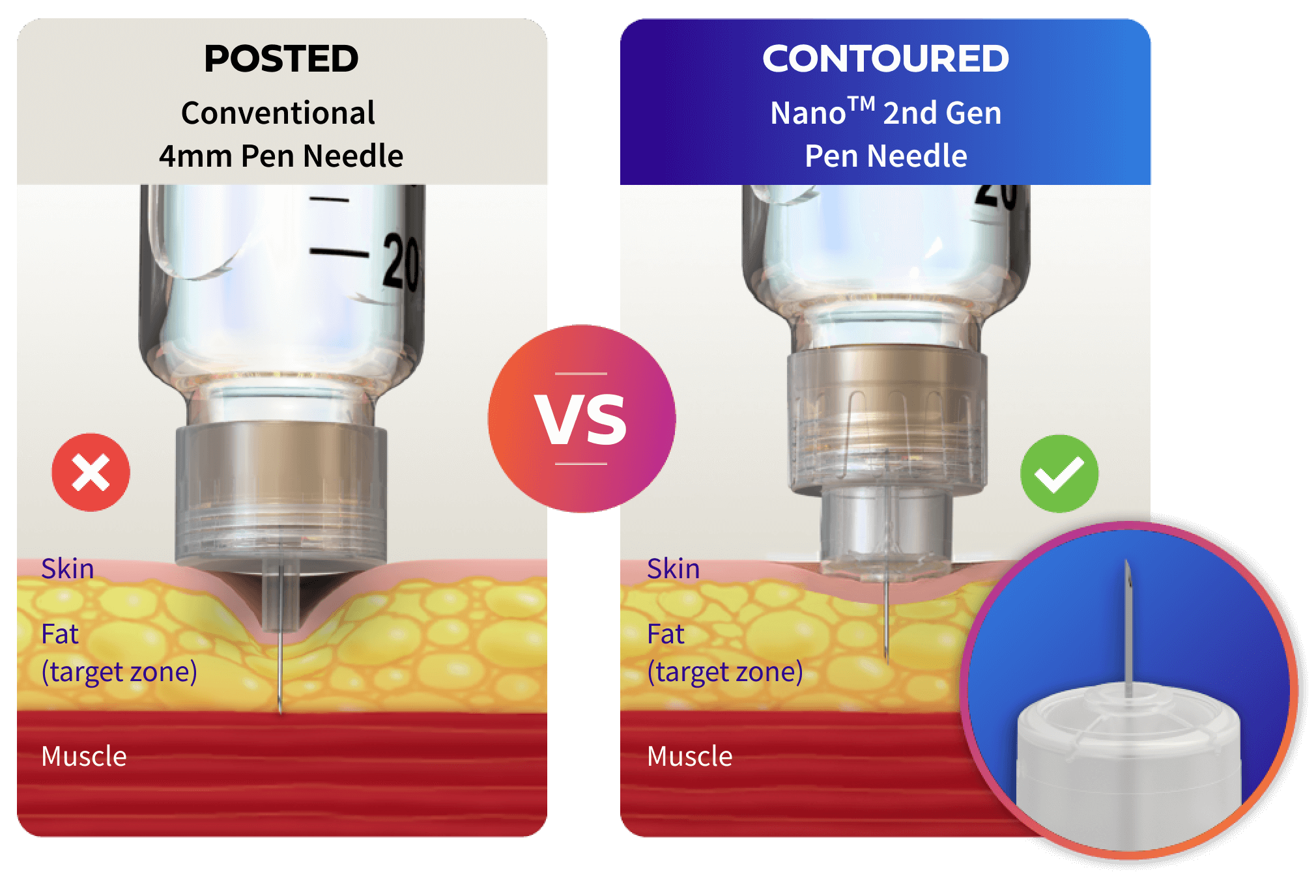 NanoTM 2nd Gen Pen Needles can lower the risk of injecting into your muscle by