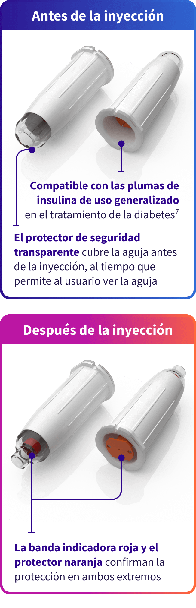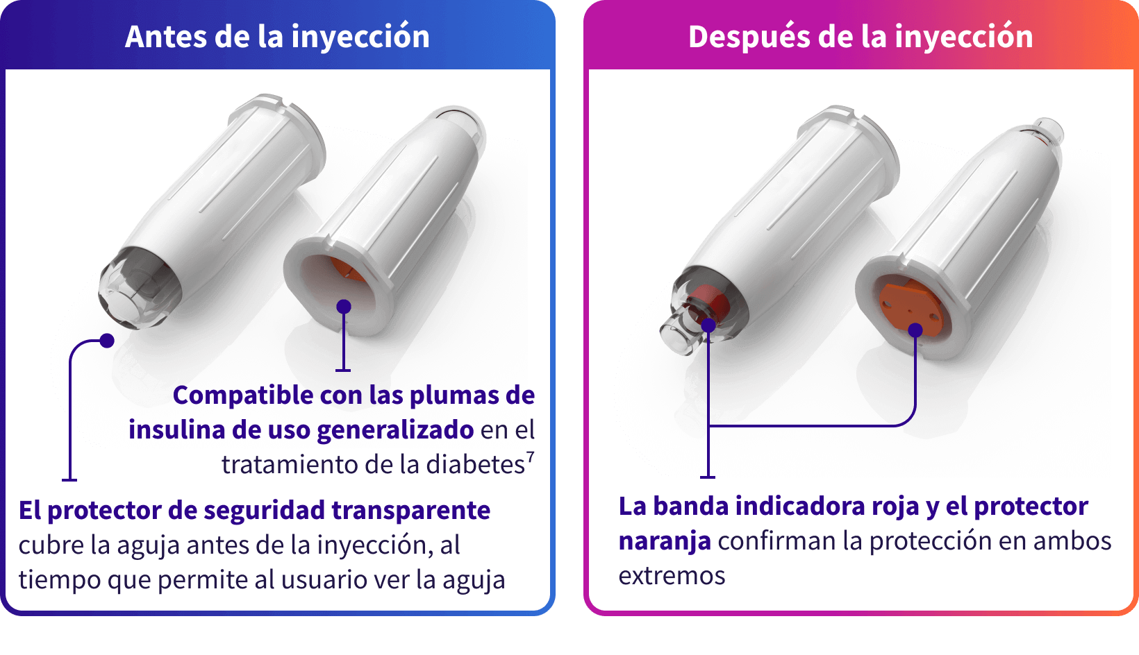 Se recomienda el uso de las agujas de seguridad para pluma de 5 mm sin la técnica del pellizco, minimizando así el riesgo de lesiones por pinchazo de aguja a través de un pliegue cutáneo.1‡