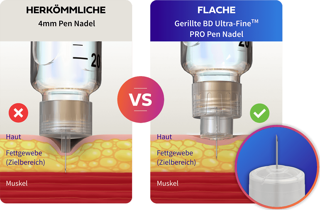 Die BD Ultra-FineTM PRO Pen-Nadeln mit der einzigartigen gerillten, flachen Nadelbasis sorgen für eine einheitliche Injektionstiefe von 4mm.1¶