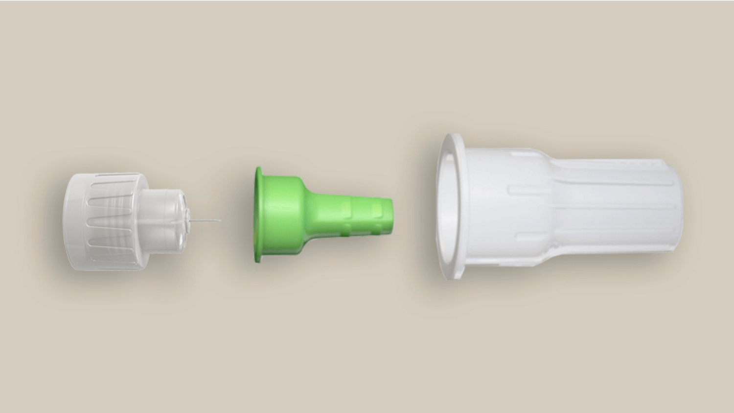 Die breitere äußere Schutzkappe erleichtert das Anbringen an einem Pen, während die kleinere innere Schutzkappe sich vor der Injektion zum Abnehmen leichter greifen lässt.4§