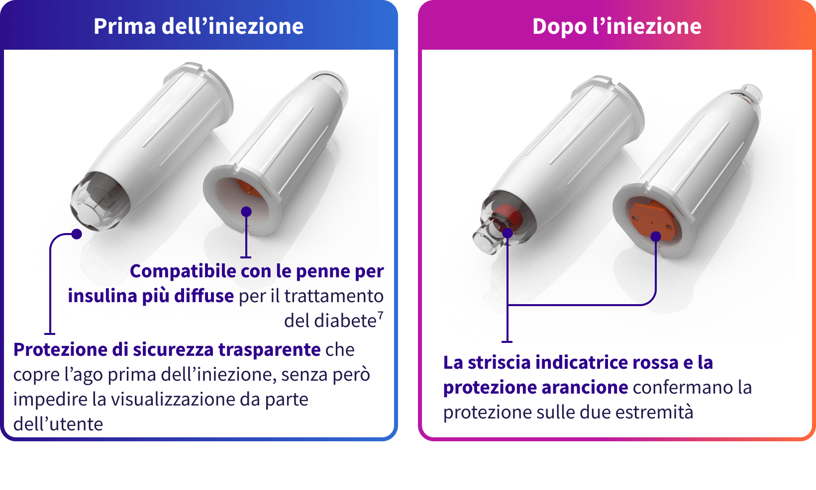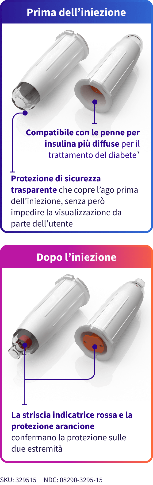 L’ago per penna di sicurezza AutoShield DuoTM da 5 mm copre automaticamente entrambe le estremità dell’ago dopo l’uso, e riduce così il rischio di ferite da ago accidentali